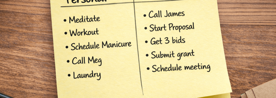I have columns on my sticky note: The left side, usually the higher-priority side, is for work items. The right side is personal to-dos, such as making appointments, phone calls, emails, cleaning, running errands, and such. I even include workouts, meditation, drinking water, and other healthy behaviors that benefit from reminders.